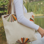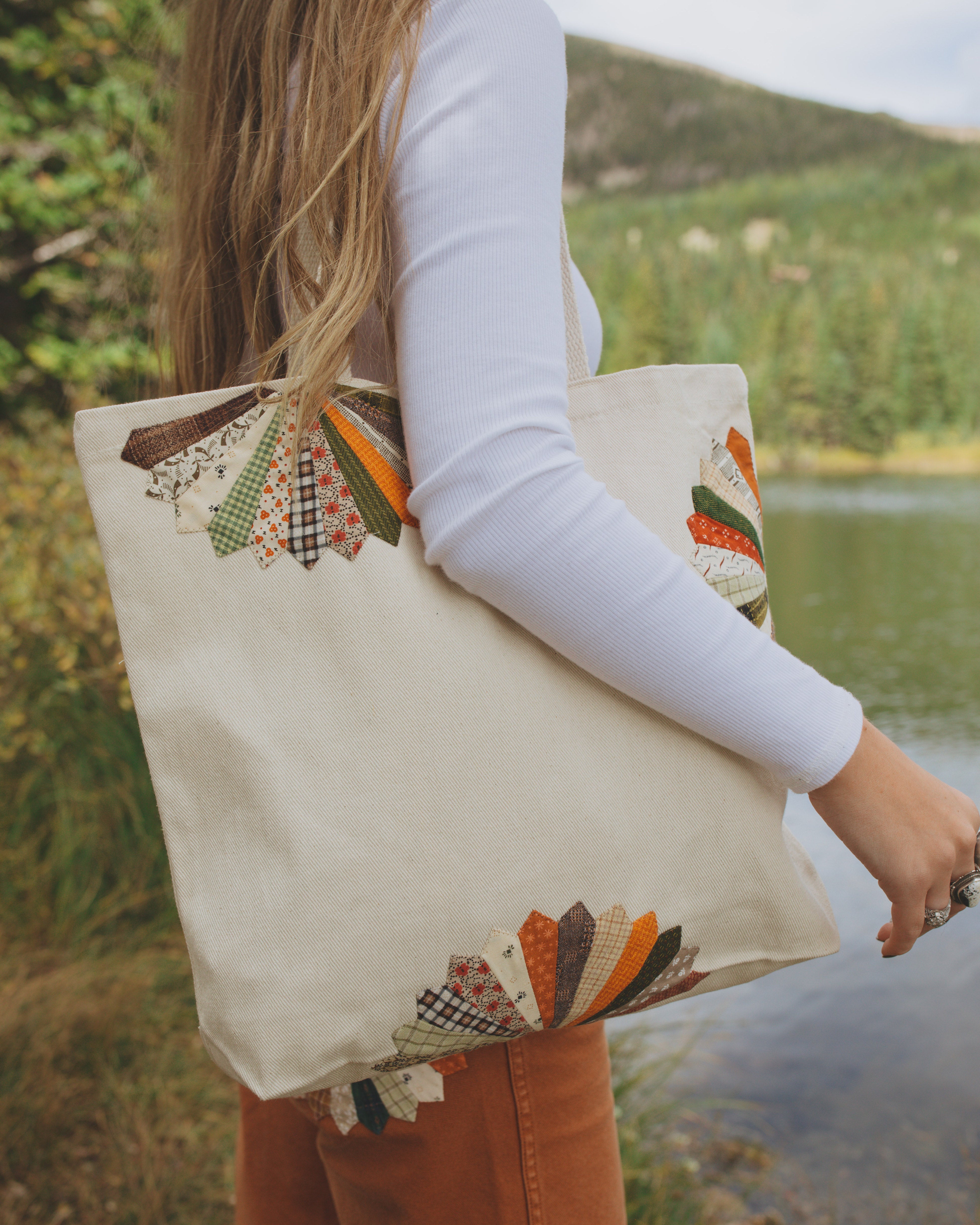 My mom has taken this cute natural cotton tote bag and hand sewn her beautiful creations (made from scrap fabric and thrifted apparel) on the front. Each bag is completely UNIQUE. I cannot wait to see where you explore with your tote! - Court