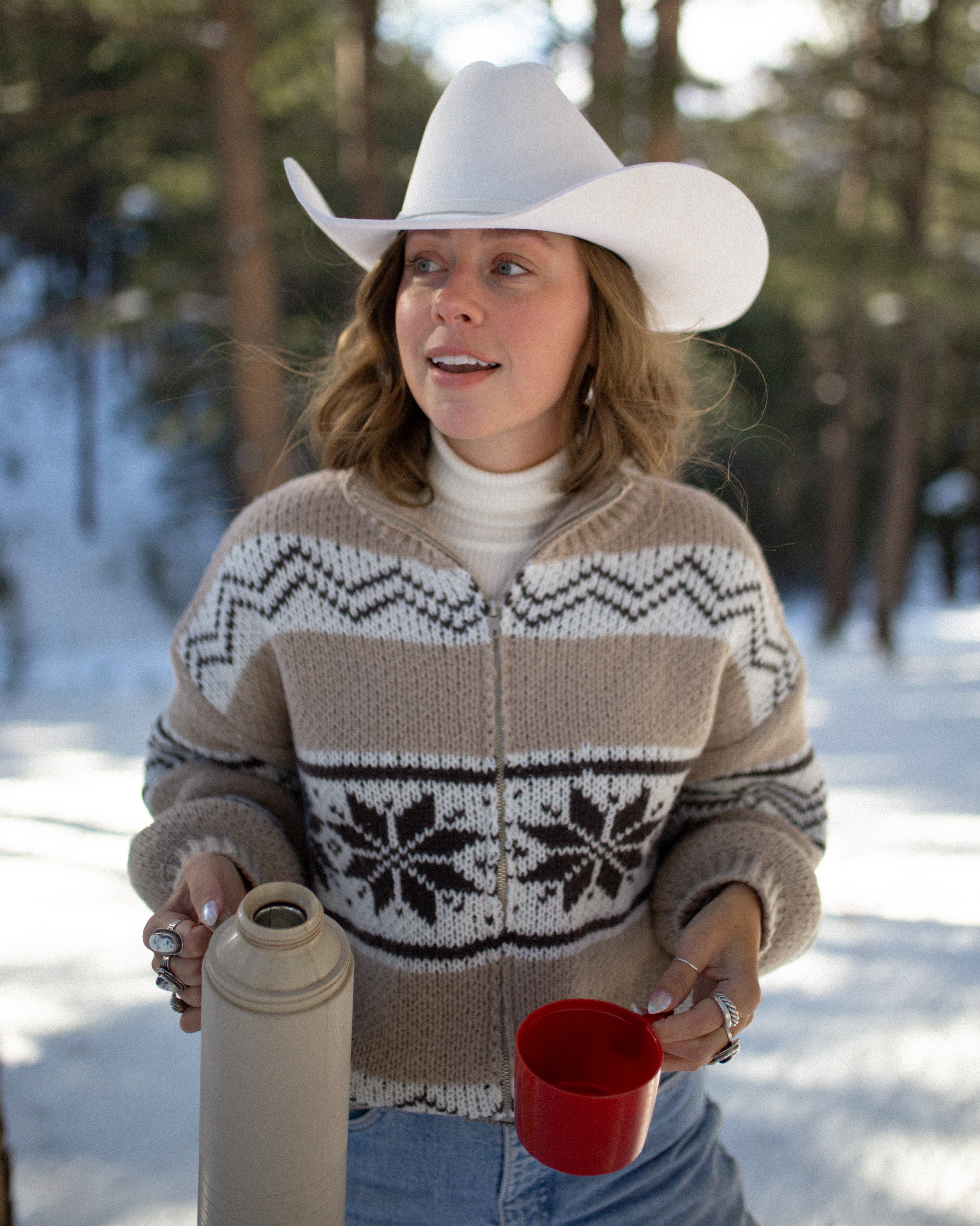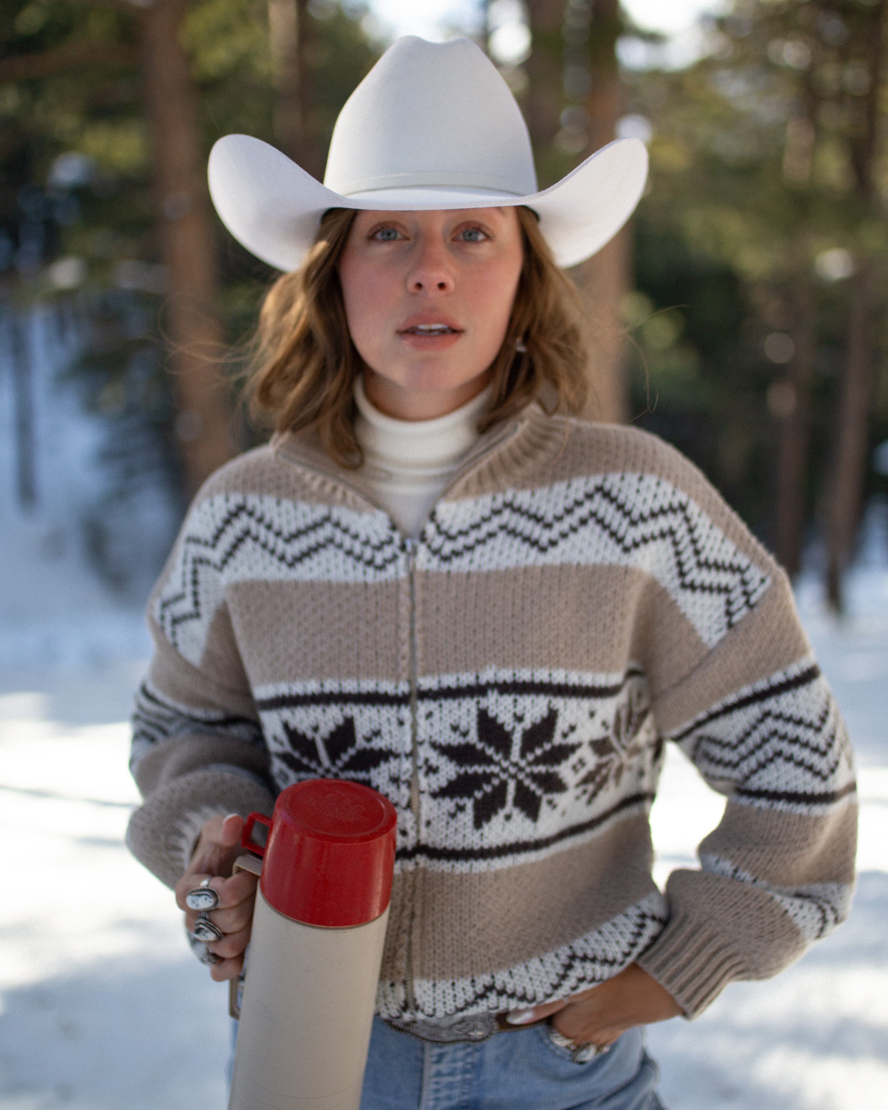 Our Nora Knit Sweater brings a vintage-inspired style that is perfect for the colder weather. I wear mine on all of my winter adventures! - Court